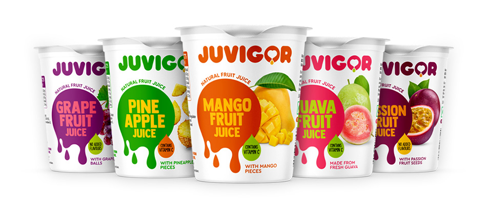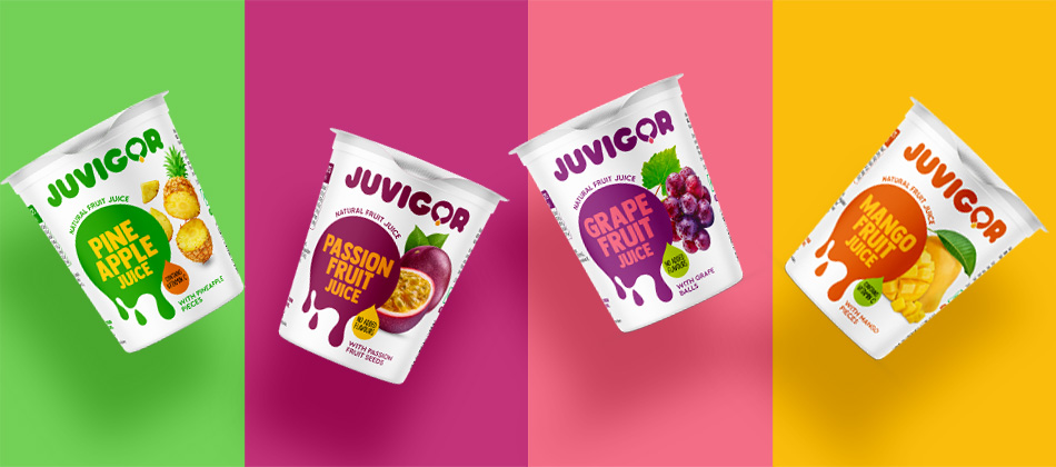 The Juvigor packaging presents a modern, vibrant, and energetic aesthetic, clearly designed to appeal to a wide consumer base. The overall design language is consistent across the flavors.