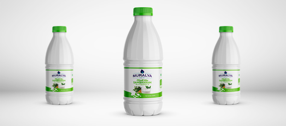 The packaging is clean, simple, and effective. The choice of green emphasizes the freshness and natural/herbal elements of Sambharam. The combination of Malayalam and English text clearly targets the local consumer base in Kerala, where the product is manufactured, while providing clarity on the product type. The design successfully marries modern dairy packaging aesthetics with a traditional regional product.